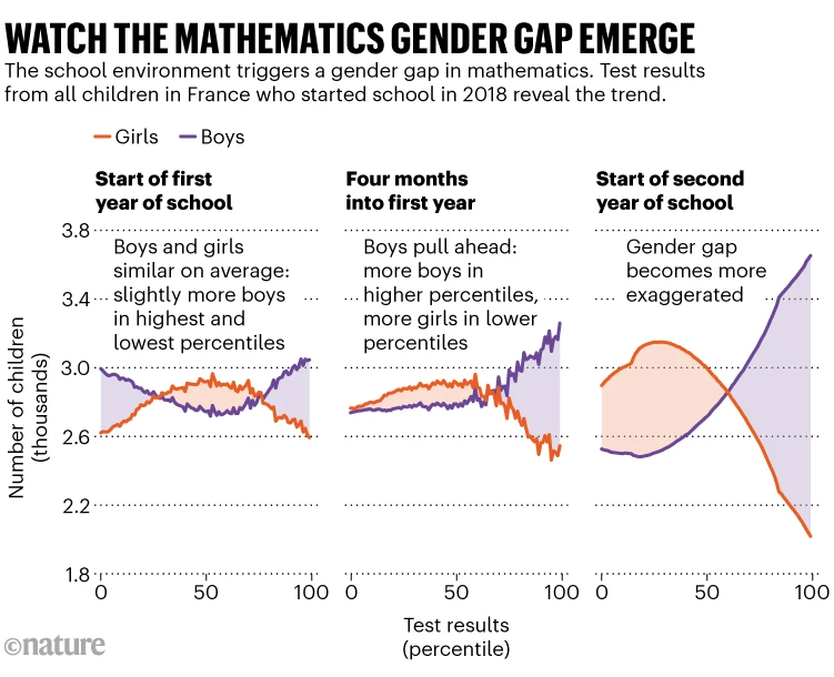 全世界范围内,青少年男生的数学成绩普遍优于女生,且数学相关职业男性占比也会更高。然而,在婴幼儿时期,研究并未发现儿童在数字认知或逻辑理解方面的性别差异[1][2][3][4]。最近,针对法国学龄儿童开展的一项大规模研究发现,这种“数学的性别差异”在入学的第一年开始显现[5]。这将为未来应对该问题提供指导。