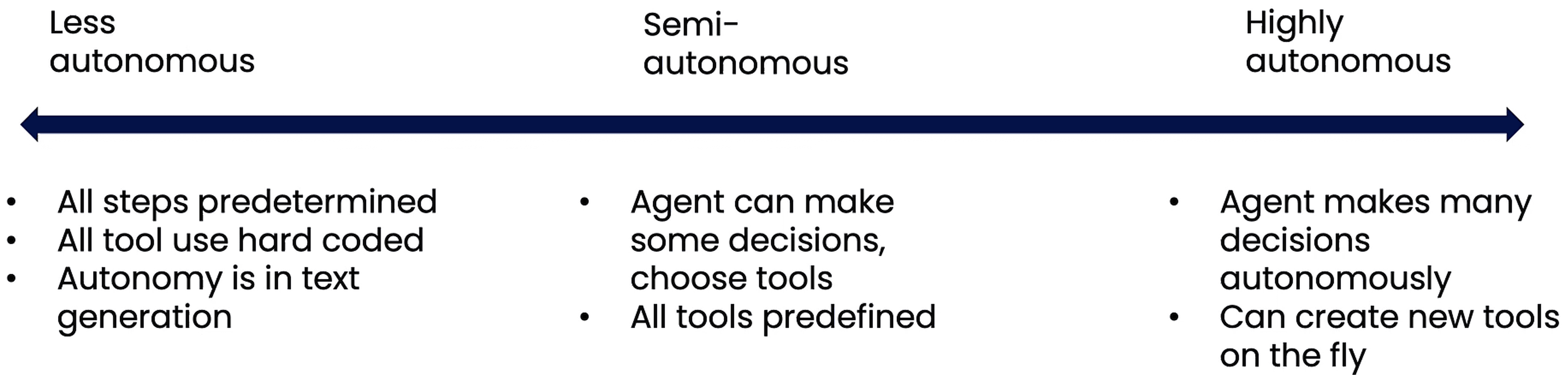 简单应用可将所有流程硬编码到智能体代码中,最高级形式则是AI全权负责,自主决策处理流程、使用甚至创建必要工具,这类智能体难度更大,目前还不是很成熟,行为上有更多不确定性,也更易出错。